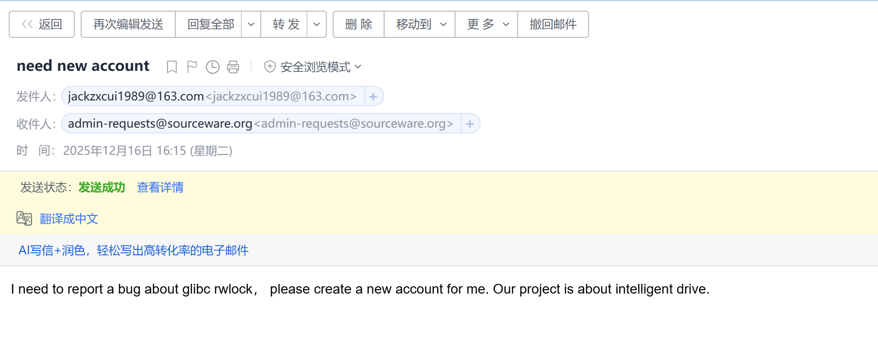 上图里的第一封邮件就是我的提问,只是暂时并没有人回答。