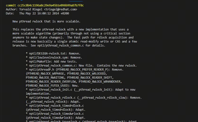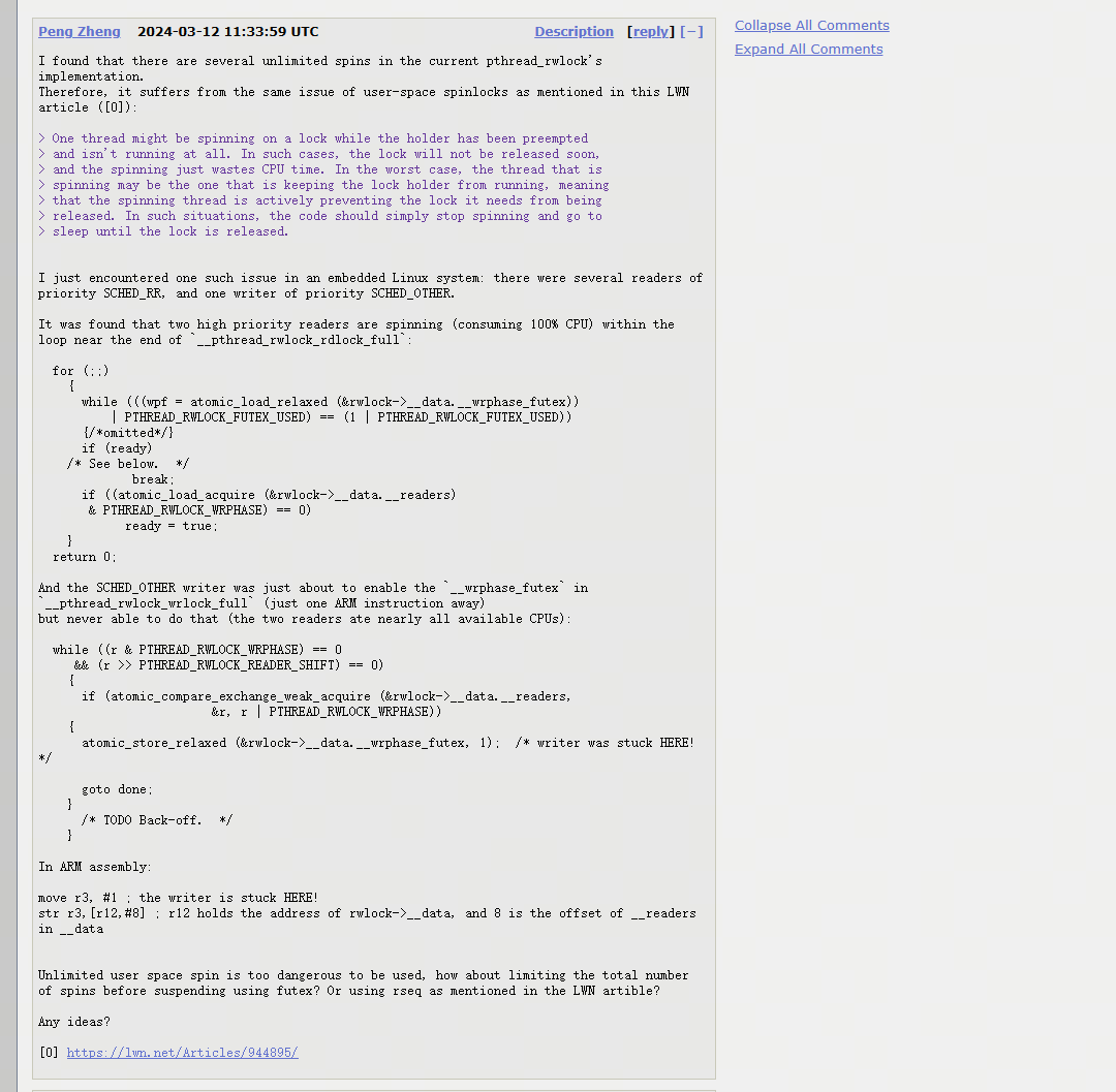 glibc的社区是一个历史悠久的社区,glibc的代码很多模块也都已经很久不更新了,不少模块在一些场景下表现得也是有一些小的性能问题,虽然说实现本身并没有什么不对,但是在一些高实时要求的场景下却可能表现得不太理想。比如之前博客讲到的cv.notify_one耗时久的问题,将来的博客会讲到的读写锁死循环问题。