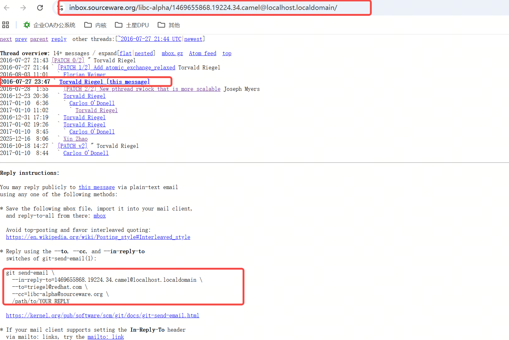 我的这封回复是用下图里的git send-email的命令来回复指定的邮件: