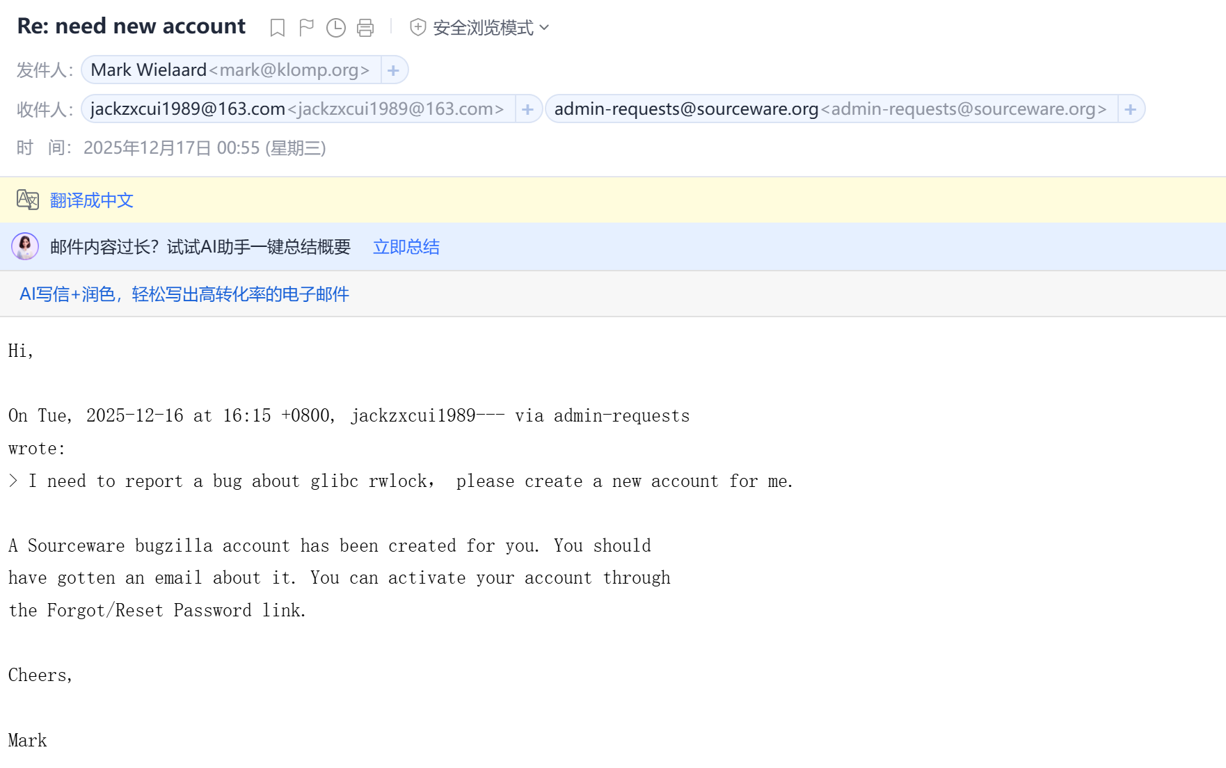 也确实收到了邮件回复,创建好了账号: