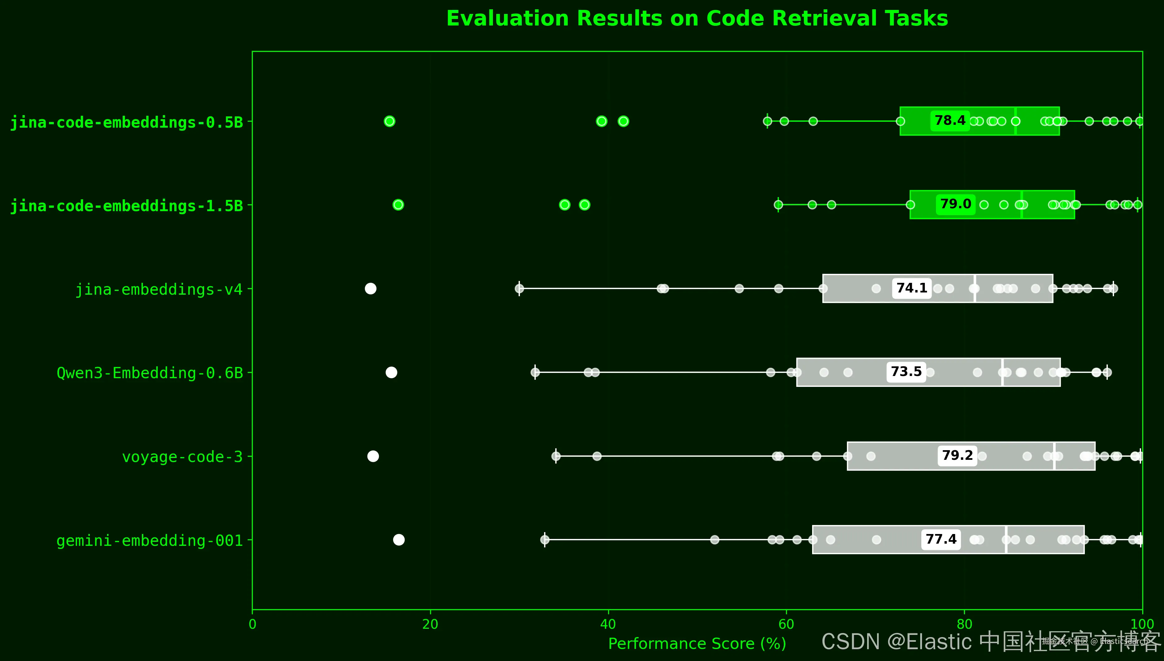 jina-code-embeddings 在 25 个代码检索基准上平均性能分别为 78.41%(0.5B)和 79.04%(1.5B)。0.5B 模型比 Qwen3-Embedding-0.6B 高 5 个百分点,尽管体积小 20%;1.5B 版本的性能与 voyage-code-3(79.23%)相当,并超过 gemini-embedding-001(77.38%)------ 这两个都是架构未公开的专有模型。