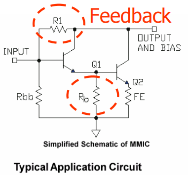 最常见的反馈(反馈)形式是什么?就是从集电极(Collector)到基极(Base)的电阻反馈 ,如图中底下那个晶体管的接法。这是实现超宽带最常用的反馈方法之一。