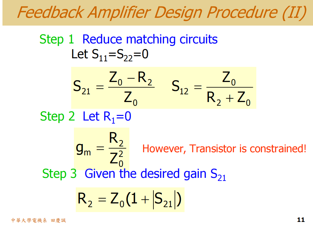这个结果非常直观!它表明,在这种特定设计下,放大器的增益( S 21 S_{21} S21)主要由反馈电阻R2控制。R2是哪个电阻呢?就是连接在输出和输入之间的那个电阻(在经典模型中,常被称为"并联反馈电阻"或"shunt feedback resistor")。