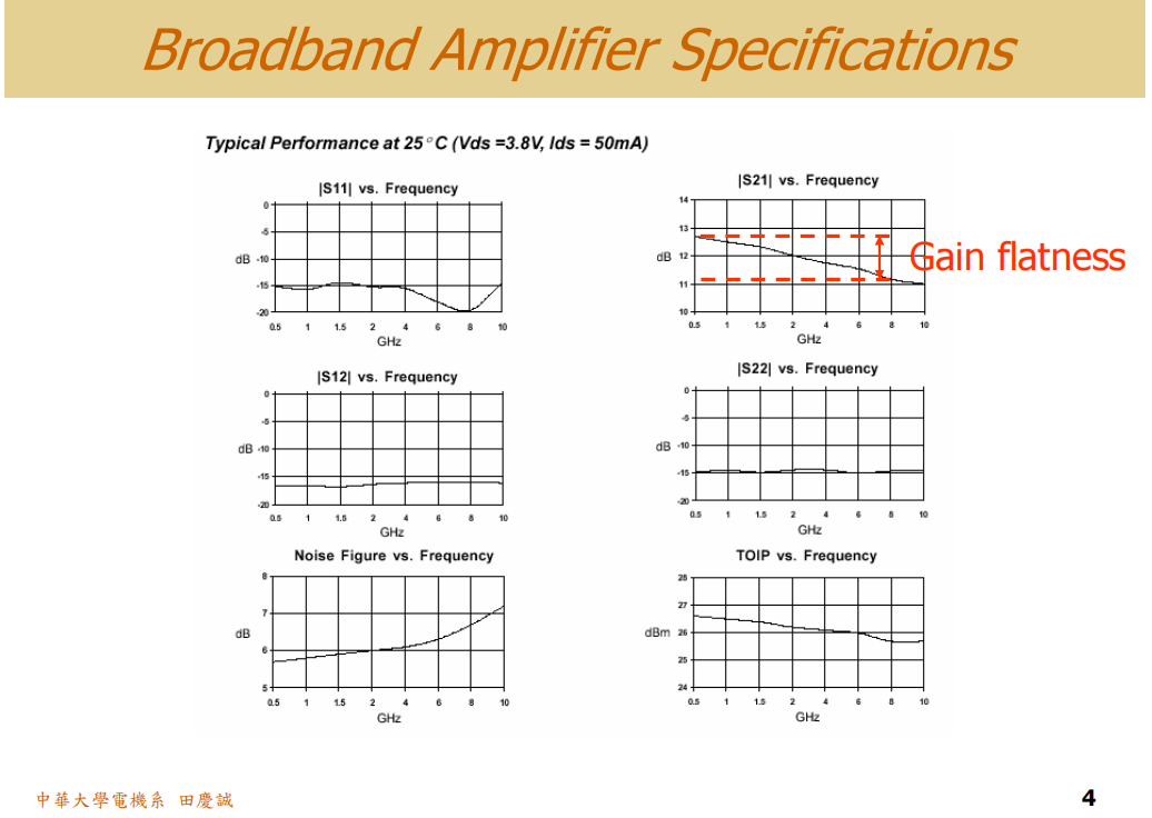 所以,当你设计一个要求正负1dB的接收机或发射机链路时,需要把指标平均分配 到每个环节,可能每个放大器只允许正负0.2dB 的波动。你看这个MMIC放大器能用吗?在1-2GHz内,它的增益掉了大概0.5dB。所以,宽带系统其实很不好做 ,指标非常严苛。当然,那种造价上百万的基站设备用的都是最好的器件。我们学校做研究,能动起来、能验证概念就好,规格要求可以适当放宽。