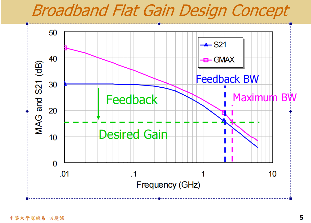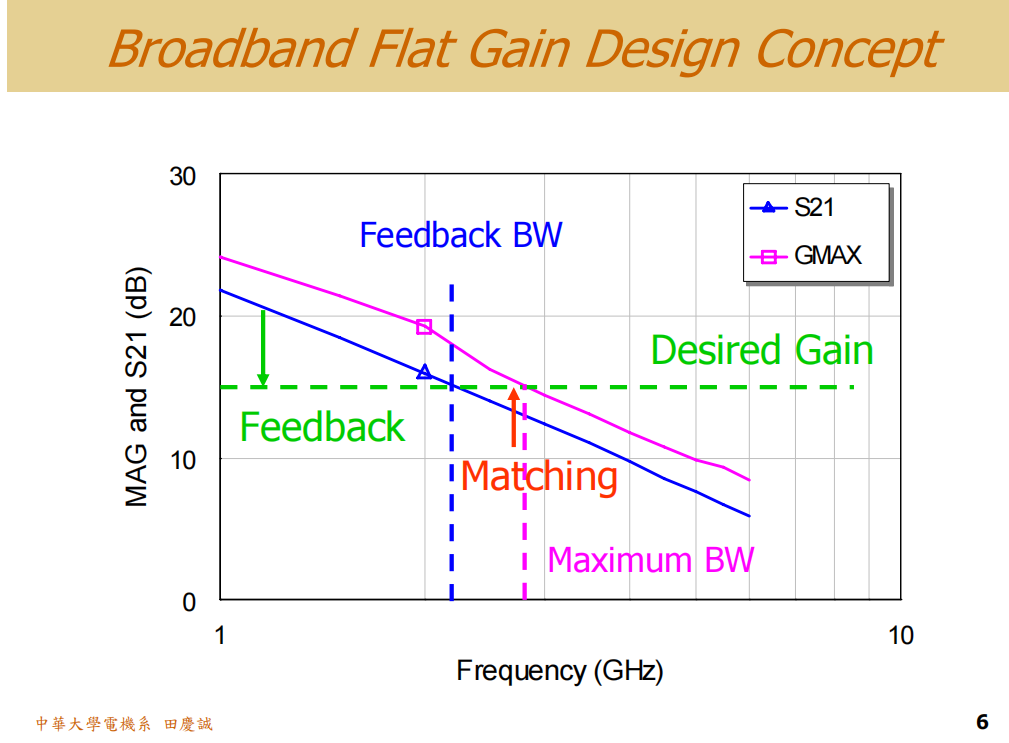 - 因此,一个晶体管最终能实现的最大增益带宽,理论上可以延伸到 G m a x G_{max} Gmax曲线与目标增益线的交点,但实际中往往通过反馈获得平坦响应,或结合反馈与匹配来优化。