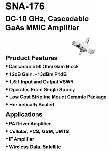 例如,你可以去查找现有厂商的现成元件 ,比如 Sirenza Microdevices (这家公司以前可能叫ST Microdevice,或者其他名称)生产的器件。他们提供的放大器,通常是基于单片微波集成电路MMIC技术,采用塑料、陶瓷等封装。这类产品的典型特点包括: