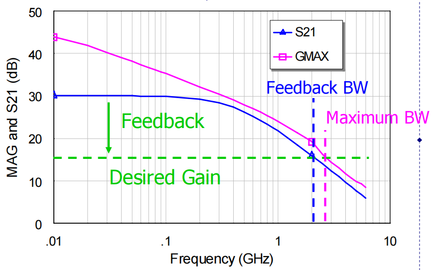- 反馈将增益拉平到某个值(如15dB),其带宽由该水平线与 S 21 S_{21} S21曲线的交点决定。
