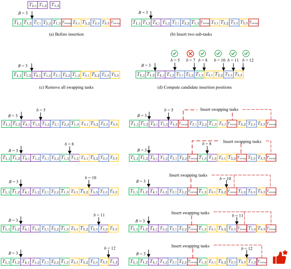 SDM从完成时间最长的无人机中随机抽取部分任务,并将其重新分配给空闲的预留无人机或新引入的按需无人机,从而实现任务负载的重新平衡。在重构过程中,原有的换电子任务被移除并重新插入以保证能量可行性,最终通过无人机间任务交换进一步降低成本或改善性能。