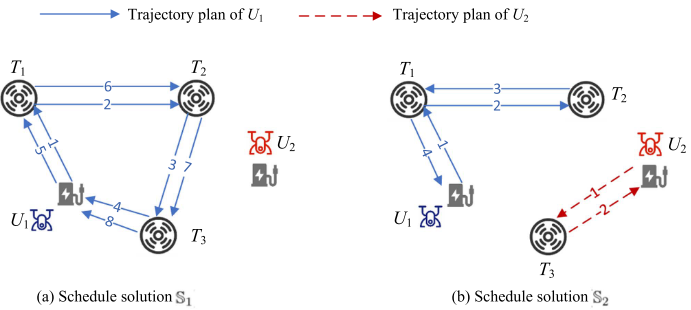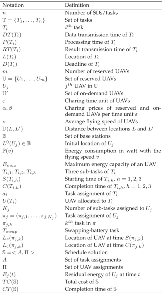 系统中存在 n n n个感知设备 (SD),每个设备周期性地产生一个计算任务,所有任务同时释放并需在给定截止时间内完成。由于计算资源同构,任务的计算与通信时延与具体资源无关,每个任务由数据传输时间、处理时间、结果回传时间、任务位置和截止期限共同描述。计算资源由两类无人机(UAV)提供:低成本的预留无人机和高成本的按需无人机。无人机以固定平均速度飞行,飞行时间由距离决定,初始均部署在基站且电量充足,并可在任一基站快速更换电池。系统仅考虑无人机飞行能耗,其能耗与飞行速度相关,且受最大能量容量约束,计算与通信能耗不计入模型。