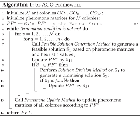 bi-ACO 算法通过多个异构蚁群并行搜索解空间,维护全局帕累托解集。在迭代过程中,蚂蚁基于信息素和启发式信息构建可行解,并对非支配解进行进一步改进;随后依据帕累托解集更新各蚁群的信息素矩阵,直至满足终止条件。