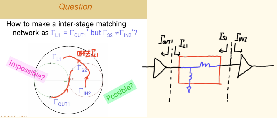 - 目标 :使第一级晶体管的输出阻抗(Γout1Γ_{out1}Γout1) 与第二级晶体管的输入阻抗(Γin2Γ_{in2}Γin2)的共轭(Γin2Γ_{in2}Γin2) 相匹配。同时,从第一级看过去的负载反射系数(ΓL1Γ_{L1}ΓL1)也要是Γout1Γ_{out1}Γout1的共轭。