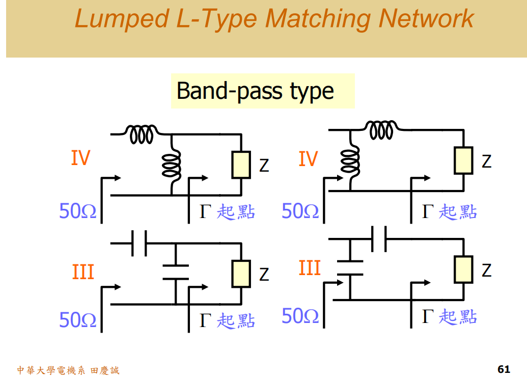- 容抗区(四区):容抗成分较强,可用两个电感(并联+串联)等组合实现匹配,同样有低通、高通及两种带通结构。