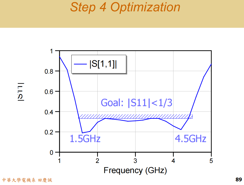- 在优化时,我们追求的不是让频带内某几个点无限趋近于完美匹配(S11=0S_{11} = 0S11=0),而是让整个目标频带(1.5-4.5 GHz)内的S11都均匀地低于某个阈值(如1/3)。