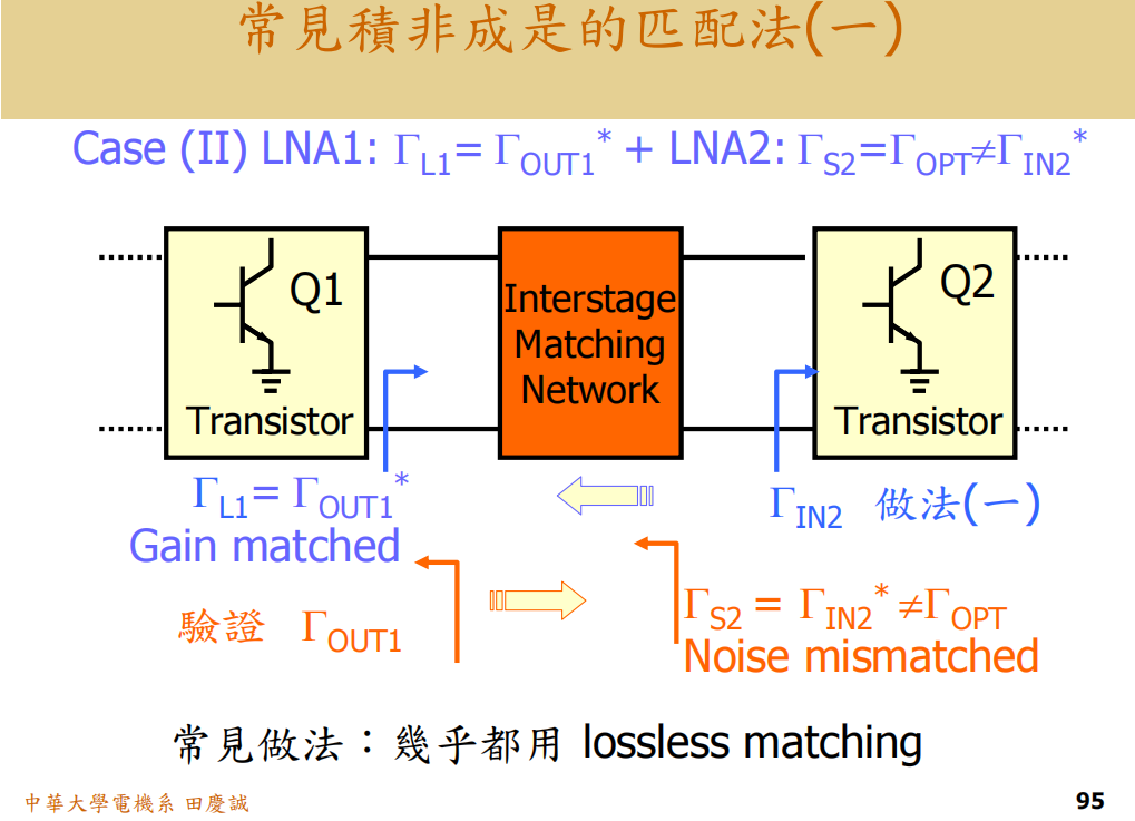 - 问题 :这样设计出来的网络,其 S11S_{11}S11 必然是Γin2∗Γ_{in2}^*Γin2∗ (共轭匹配),但这不等于 Γopt2Γ_{opt2}Γopt2!因此,第二级的噪声匹配(ΓS2Γ_{S2}ΓS2 = Γopt2Γ_{opt2}Γopt2)被破坏了 。你保住了第一级的噪声和增益,但牺牲了第二级的噪声。