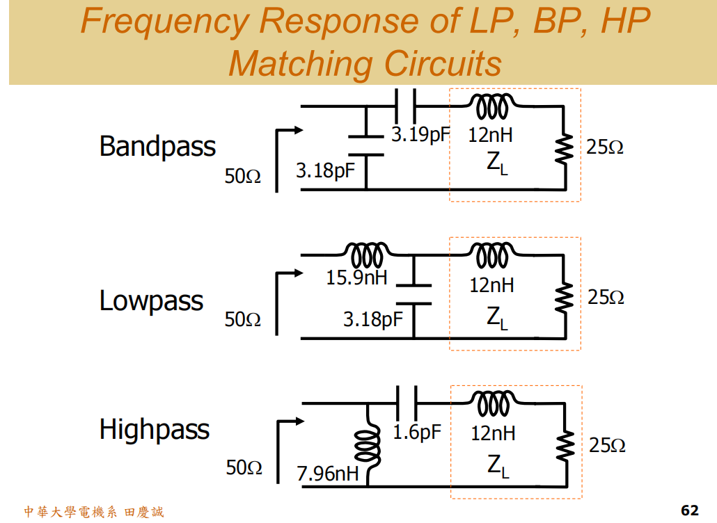 我们再来看Bandpass(带通)网络。它由一个Low-Pass元件和一个High-Pass元件组成,对不对?现在再加上负载那个Low-Pass元件。