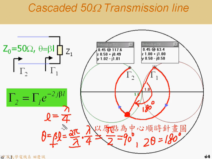 - 这就是史密斯圆图的神奇之处:从"阻抗圆图"视角切换到"导纳圆图"视角,在程序里只是一个简单的复数运算,却对应了图上强大的可视化转换。