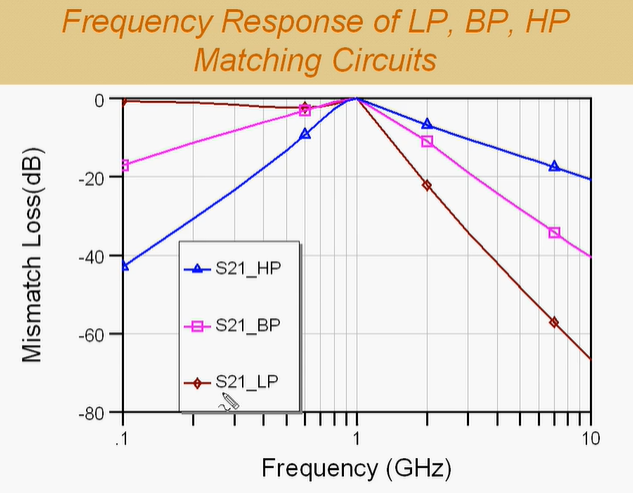 对于Low-Pass电路(图中棕色线),在低频(接近DC)时信号能通过(衰减小),体现出"低通"特性;在目标频率(如1GHz)附近有一个匹配好的通带。