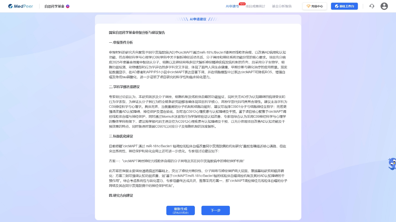 针对以上痛点,理想的AI辅助工具不应只是一个简单的文本生成器,而应扮演一个理解科研逻辑、拥有强大知识库的"智能研究助理"。它应当能够深度参与从选题深化到初稿成型的全流程。我去年申报的时候用了MedPeer的国自然申请书撰写工具,在一开始就给了我一个逻辑清晰的初稿,帮我节省了很多时间。