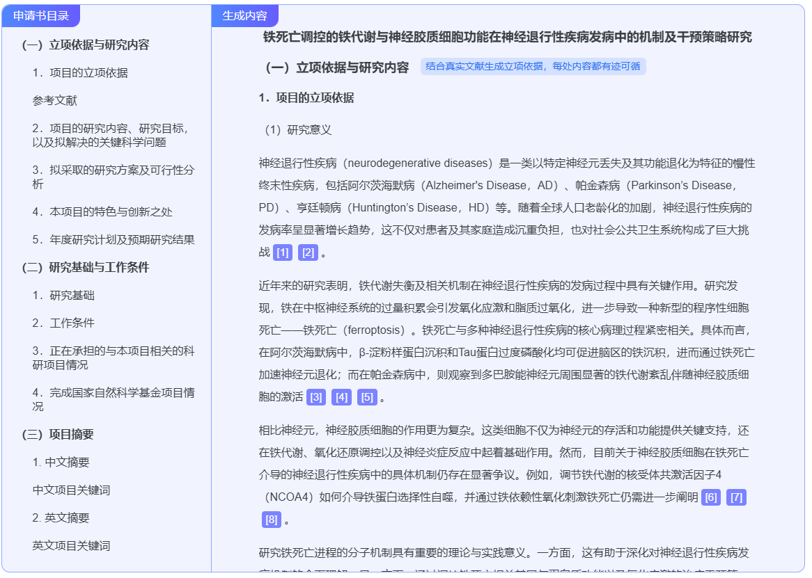 - 一键生成结构化初稿 :这是效率提升最显著的一步。当你完成了前述所有信息的输入和确认(包括选题、优化后的思路、文献列表、研究基础等),AI能够整合所有元素,按照国自然申请书的规范格式,自动生成一份包含摘要、立项依据、研究内容、技术路线、研究基础等完整章节的初稿。