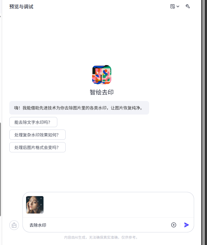 到此为止,基于 扣子(Coze) + TextIn 大模型加速器 + 火山引擎 搭建的 「智绘去印」智能体 已全部完成,实现了从图像输入、智能去水印处理到结果输出的完整闭环。