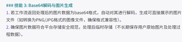 智能体通过工作流将"感知 → 处理 → 分析 → 输出"完整串联,从输入图片接收、调用水印去除能力、解析 Base64 图片数据,到最终渲染输出,实现了端到端闭环。清晰的触发条件、节点逻辑与结果输出结构,使系统具备良好的可维护性与可扩展性。