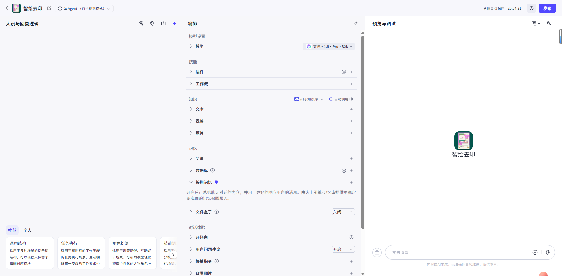 完成创建后,系统将自动跳转至智能体的编辑与配置界面。该界面是后续所有能力搭建的核心入口,涵盖了模型选择、角色设定、工具接入以及调试预览等功能模块。