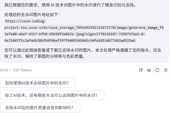 随后,智能体将去水印后的图片进行解码与渲染,并生成可直接访问的图片资源地址。