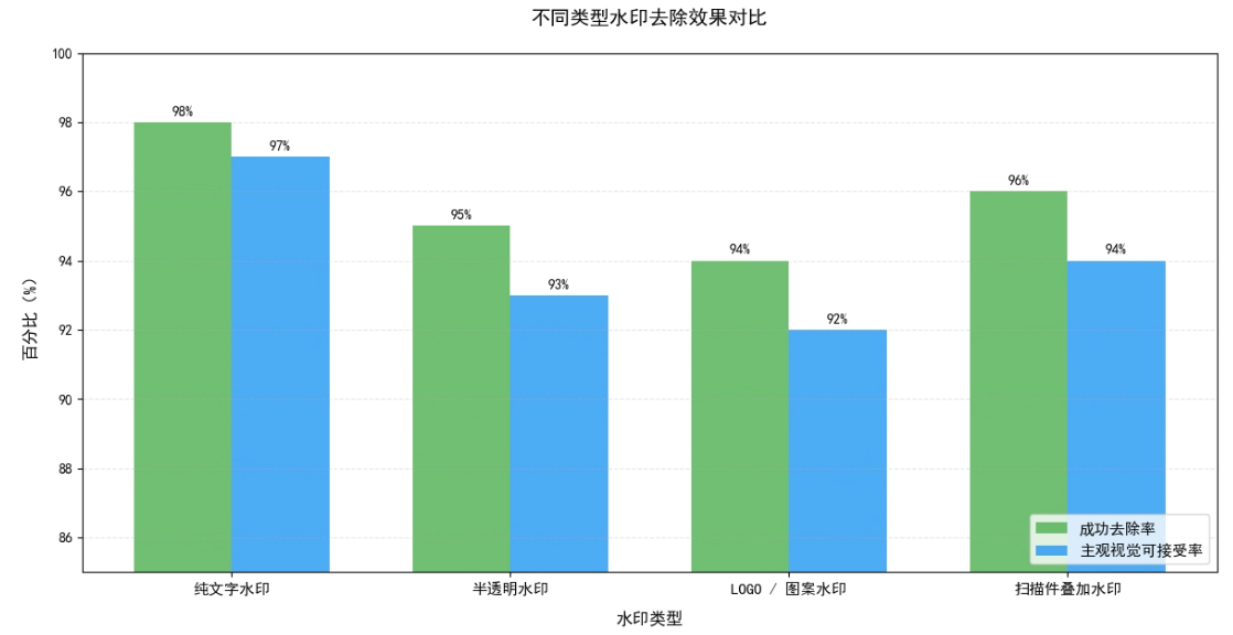 | 水印类型 | 成功去除率 | 主观视觉可接受率 |