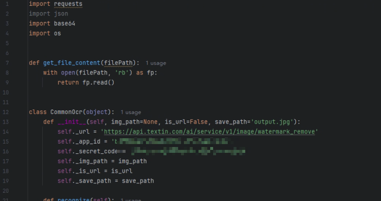 下面展示的是使用 TextIn 图像水印去除 API 的完整示例代码。