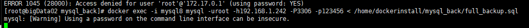 docker exec -i mysql8 mysql -uroot -h192.168.1.242 -P3306 -p****** < /home/dockerinstall/mysql_back/full_backup.sql