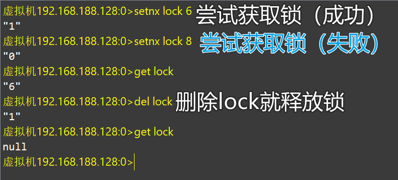 setnx命令会当某个key不存在的时候才给该key设置值。Set the value of a key, only if the key does not exist(只有这个key不存在的时候才给其设置值) setnx lock 6是获取锁del lock是释放锁(删除锁是释放锁)- 要给key设置过期时间,避免因为某些原因导致死锁