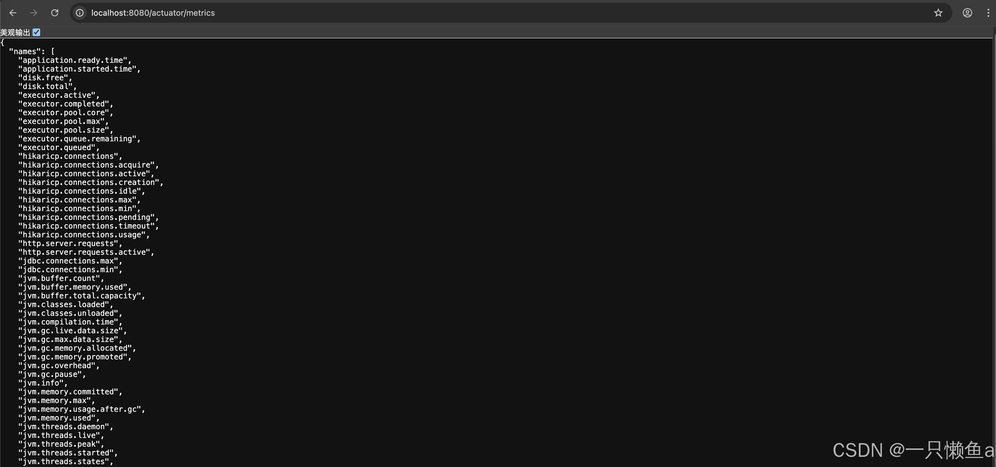 用于获取应用程序中所有可用的指标 http://localhost:8080/actuator/metrics