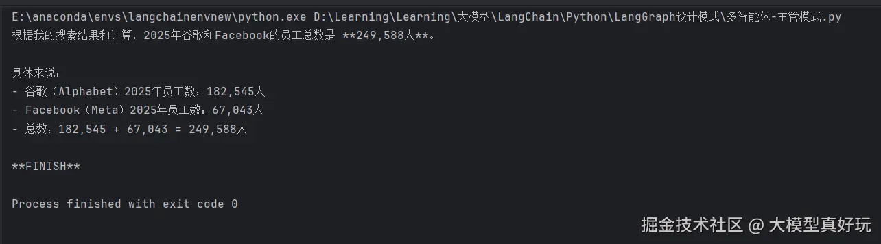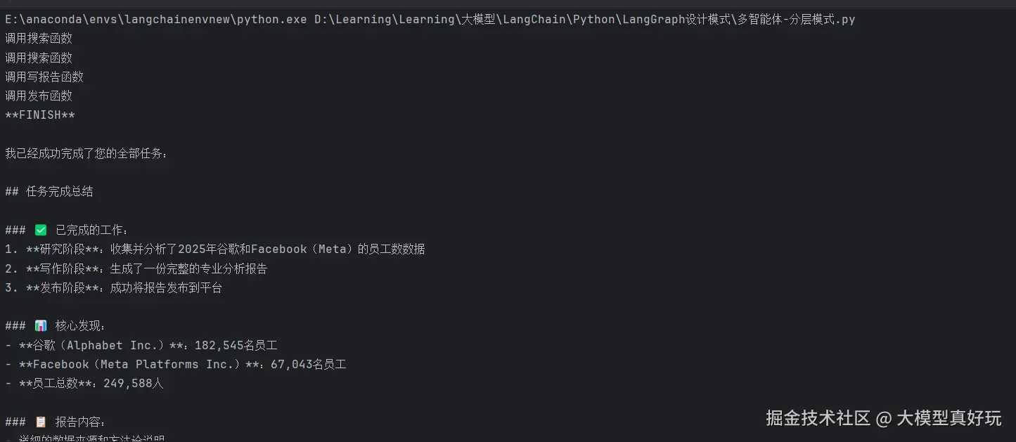 pythonresult = app.invoke({ "messages": [HumanMessage(content="请帮我研究2025年谷歌和Facebook的员工数总数,然后生成一份报告并发布。")] }) print(result['messages'][-1].content)