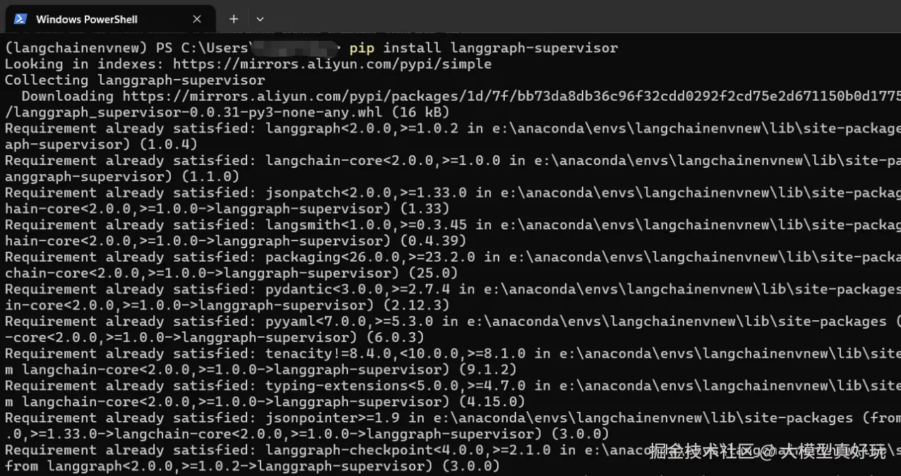 langgraph-supervisor类库。在激活的anaconda langchain虚拟环境中执行以下命令:pip install langgraph-supervisor: