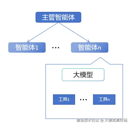 - 主管架构 就像一家公司的整体组织结构。CEO(主管智能体)管理着不同的部门(专业智能体),如市场部、工程部。他决定哪些部门参与某个项目,并协调部门间的合作。