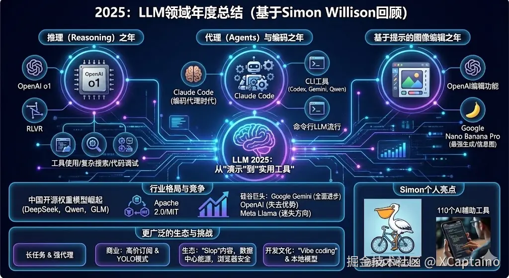 2025年是LLM从"惊艳演示"走向"真正实用工具"的一年,尤其是编码代理、推理能力和图像编辑三大突破深刻改变了开发者和普通用户的使用方式。中国开源模型和Google Gemini的强势崛起,打破了美国实验室的垄断格局,同时也带来了更高的安全、能源和内容质量挑战。
