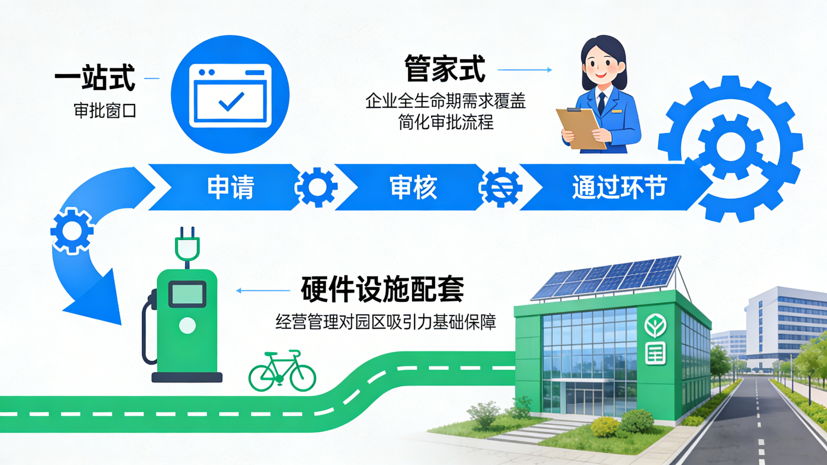 (一)园区应聚焦企业全生命周期需求,优化政务服务流程,推行"一站式"审批、"管家式"服务,简化企业入驻、项目建设、生产运营等环节的审批手续,降低企业制度性交易成本。例如,设立专门的服务团队,为入驻企业提供政策对接、工商注册、税务办理、人才招聘等全程代办服务,让企业"少跑腿、好办事"。