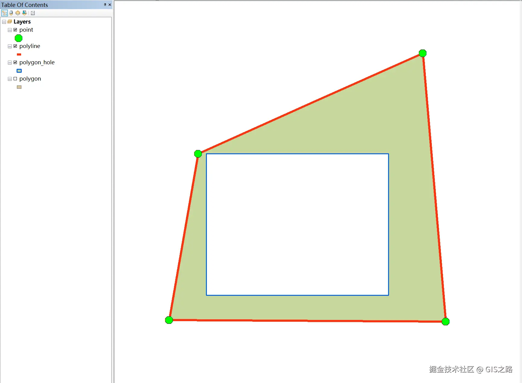 此外还有一种带有孔洞的多边形需要注意一下,此时环形几何对象分为内环和外环两种类型。