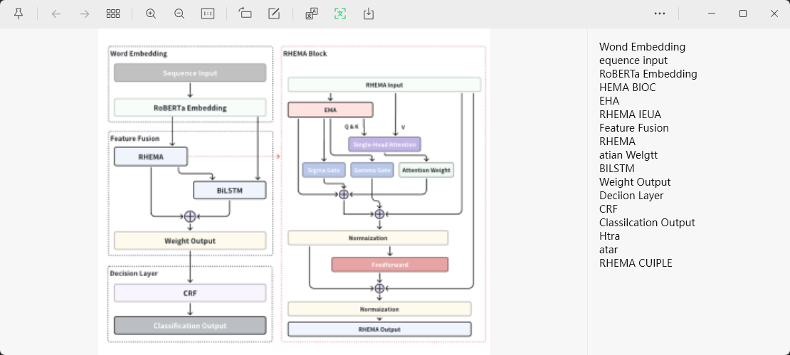 若换成表格或图片结构图,问题会更突出。 如图所示,左侧是模型结构示意图,右侧是传统 OCR 的识别结果,可以看到: