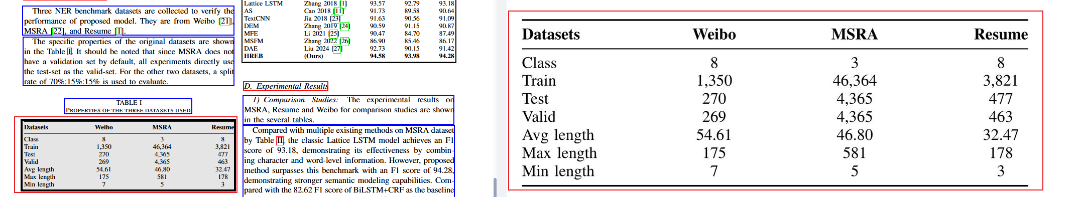 原文中的表格被解析为带行列头的结构化表数据,而不是一串Datasets Weibo MSRA Resume Class 8 3 8 ...的扁平文本,可直接用于数据统计、可视化与自动分析。