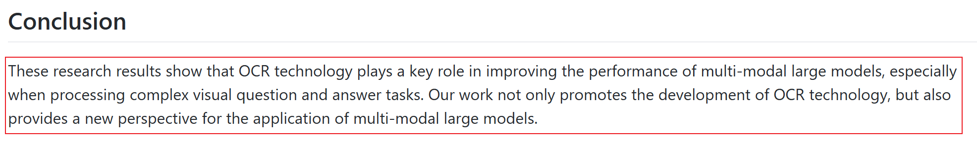 这些研究成果表明,OCR技术在提升多模态大模型性能方面发挥着关键作用,尤其是在处理复杂的视觉问答任务时。我们的工作不仅推动了OCR技术的发展,也为多模态大模型的应用提供了新的视角。