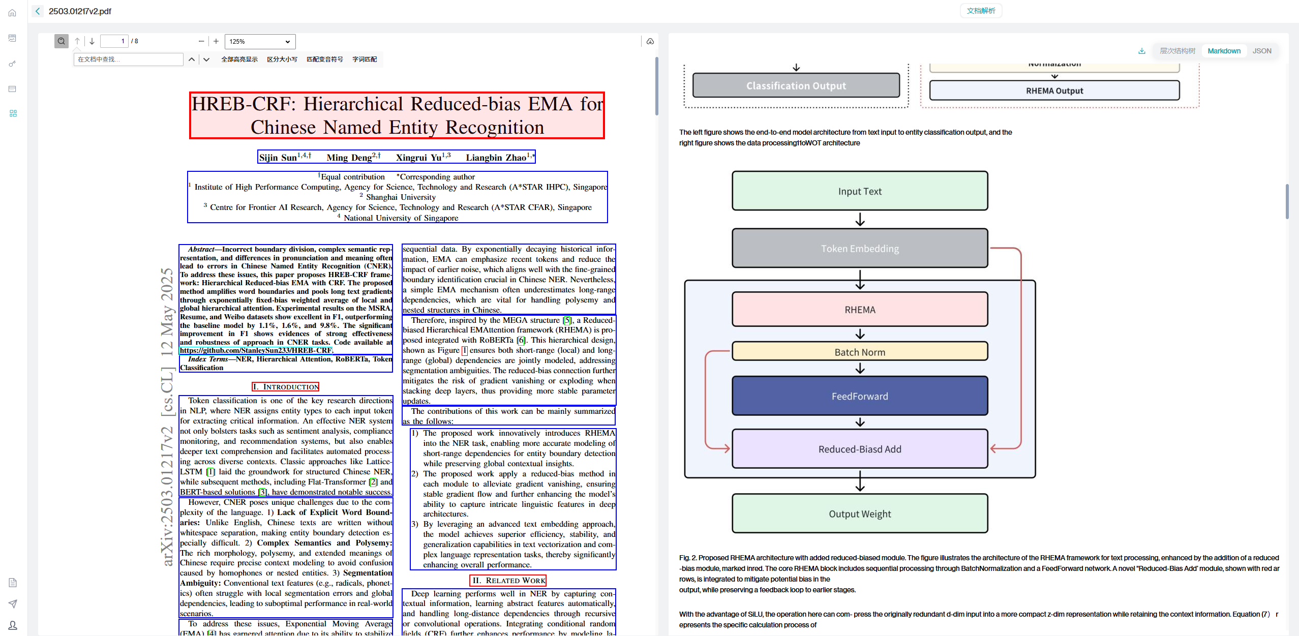 如图左侧所示,原始 PDF 中包含标题、作者、机构、摘要、关键词和正文多个区域。