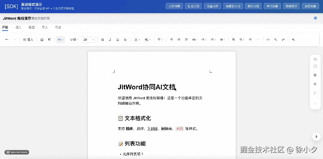 jitword SDK 采用微内核架构,核心引擎仅2.3MB,我们采用了三层架构设计:渲染层、协同层、AI能力层;支持 WebSocket 实时通信,CRDT算法解决冲突;内置AI助手,支持智能写作、内容优化、知识问答等。