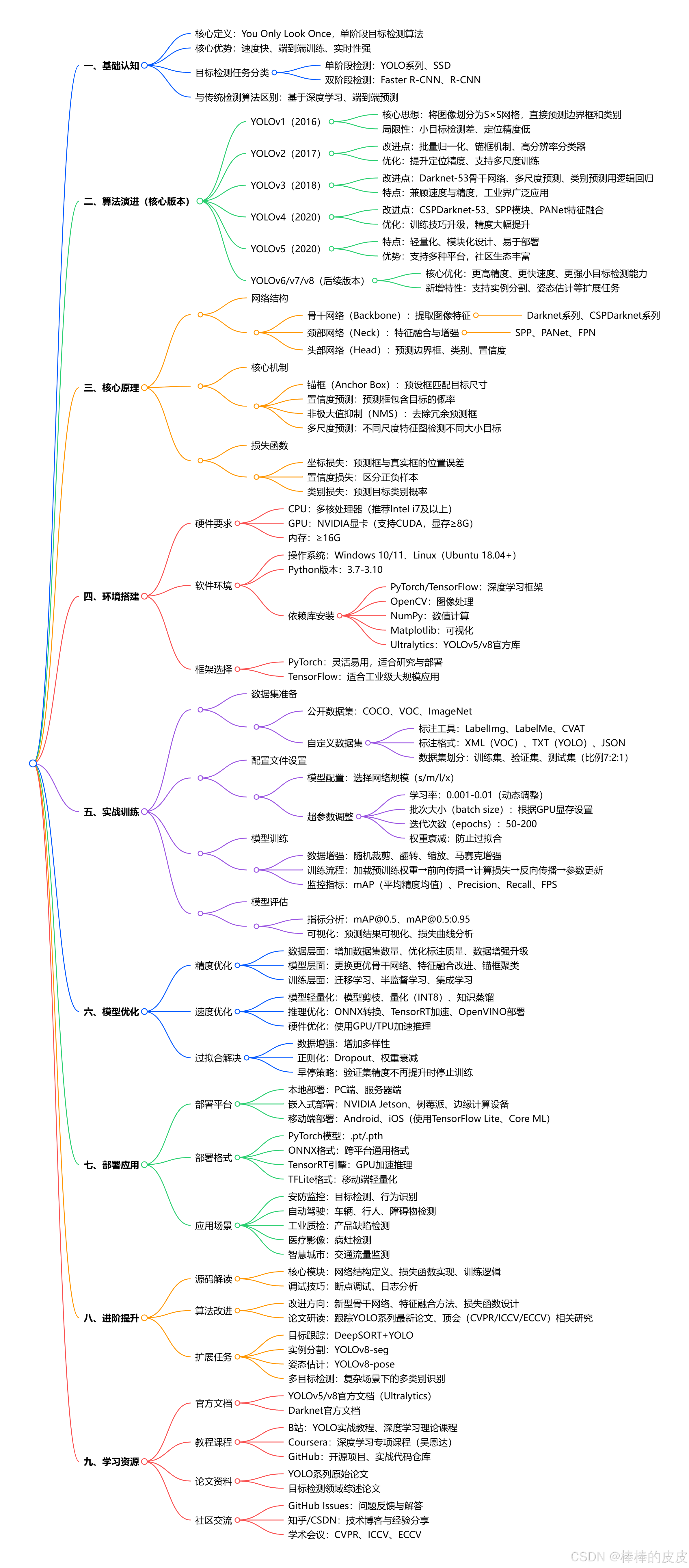 YOLO 深度学习思维导图是从入门到精通的全流程指南,结构清晰地覆盖了学习、实践、进阶的核心模块,我帮你拆解关键信息: