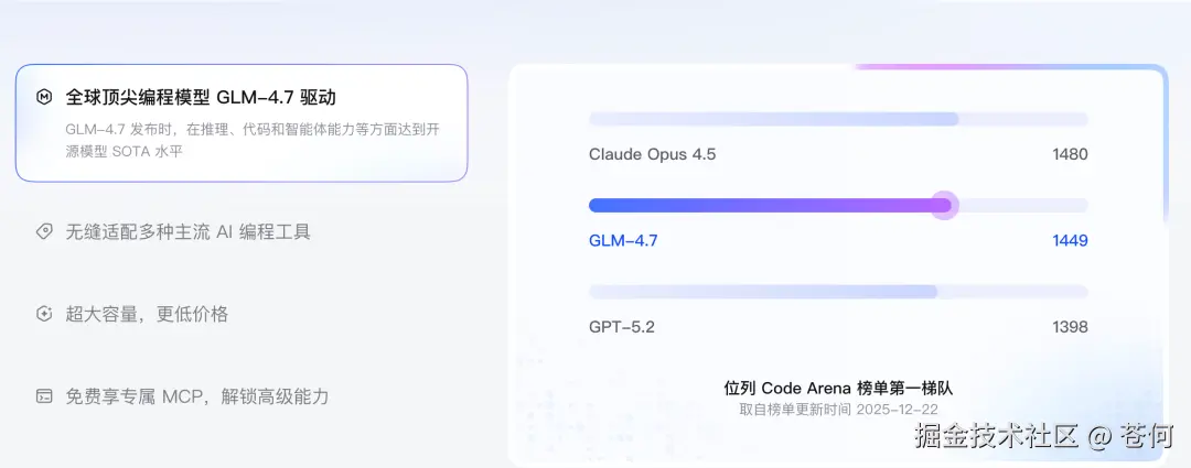 能力侧,先来看一张时间取自于 2025 年 12 月 22日的模型榜单图,可以看到和 Claude Opus 4.5 打的有来有回。