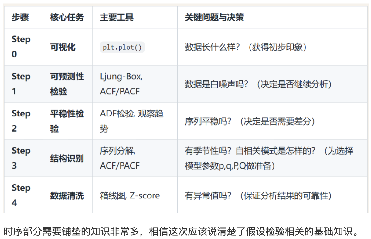作为零基础的 Python 和机器学习学习者,想要吃透时序数据检验的核心知识点(假设检验基础、白噪声、平稳性、季节性检验),我会用最接地气的语言、生活化的例子拆解,再配合一步一步能运行的代码,确保你完全理解 ------ 咱们不抠复杂术语,只讲 "能听懂、能上手" 的内容。
