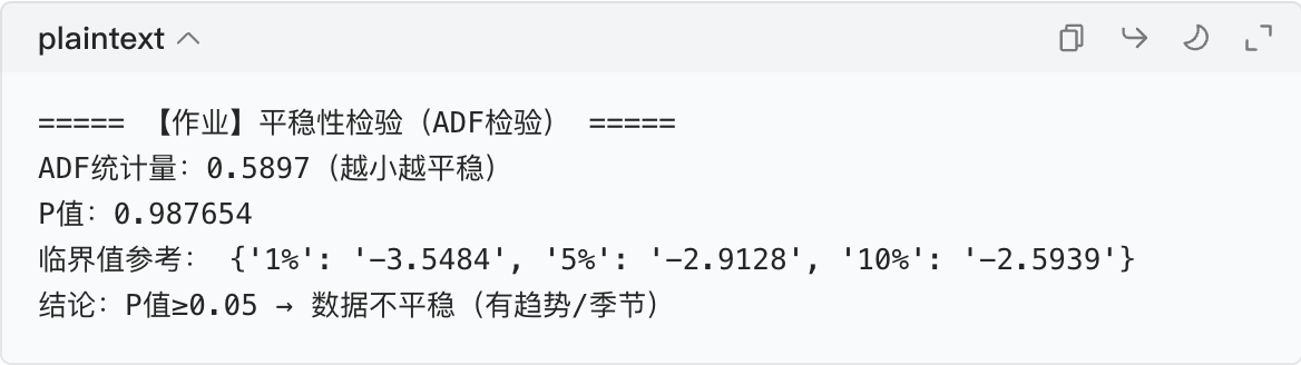 print("\n===== 【作业】平稳性检验(ADF检验) =====")