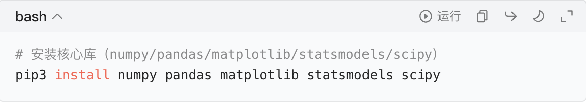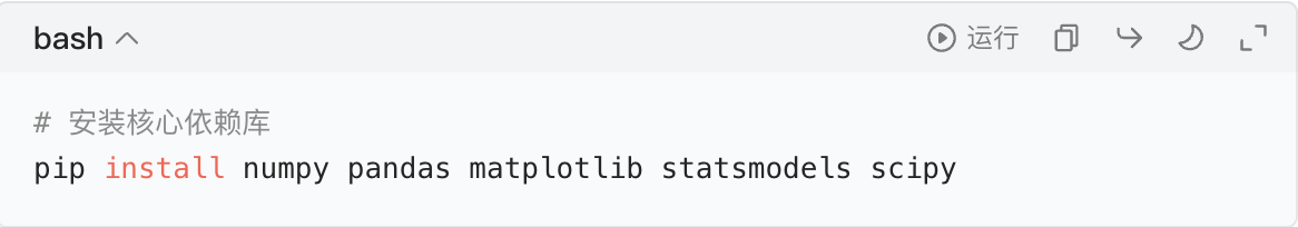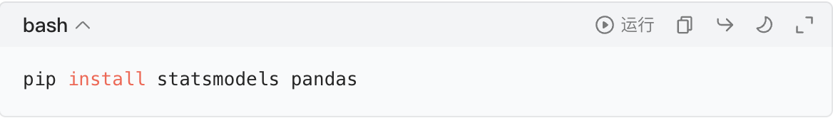 先安装时序分析核心库:pip install statsmodels pandas