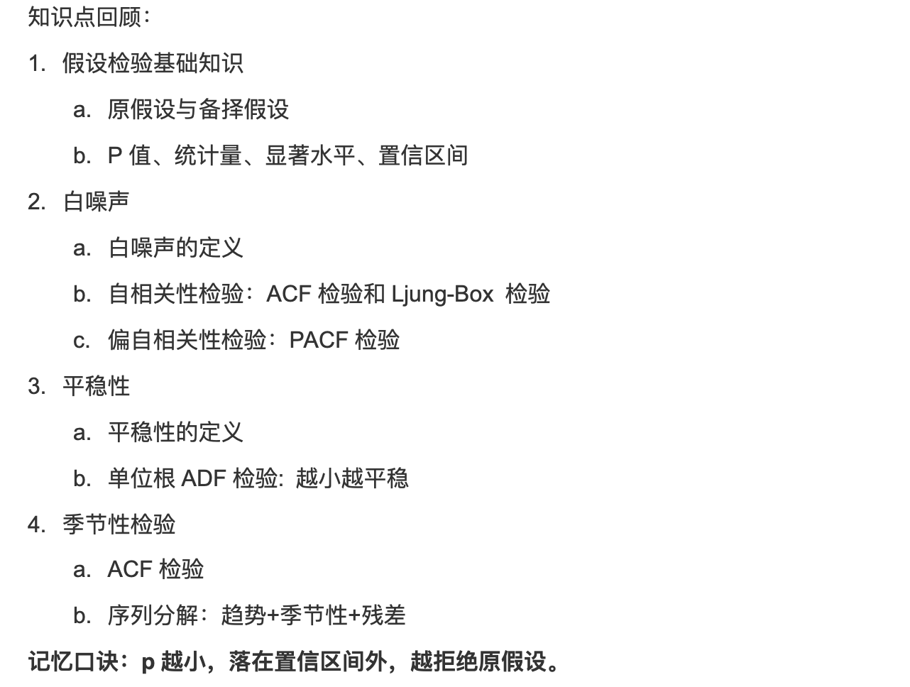 - 原假设(H₀):"默认成立、没变化、没差异" 的假设(比如法官先假设 "嫌疑人无罪")。例:"这个时序数据是白噪声(没规律)""这个数据是不平稳的",都是检验里常见的原假设。