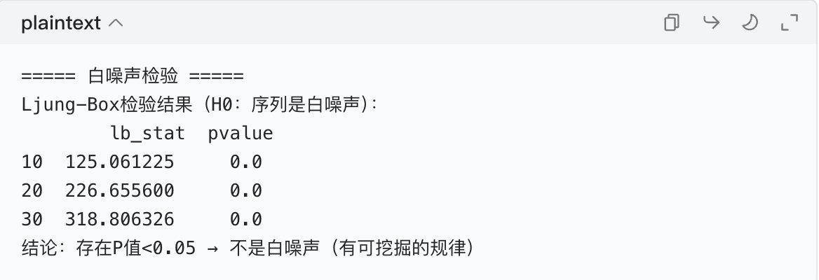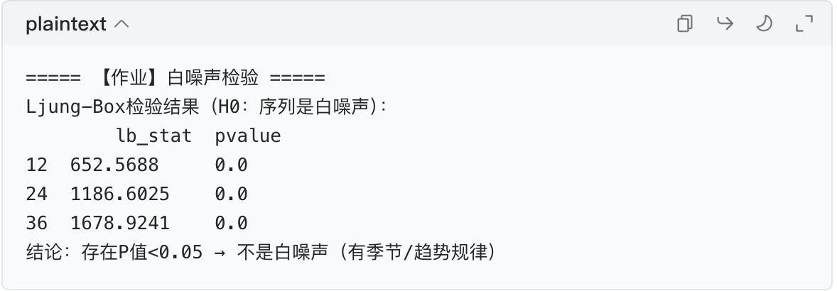 print("结论:存在P值<0.05 → 不是白噪声(有季节/趋势规律)")